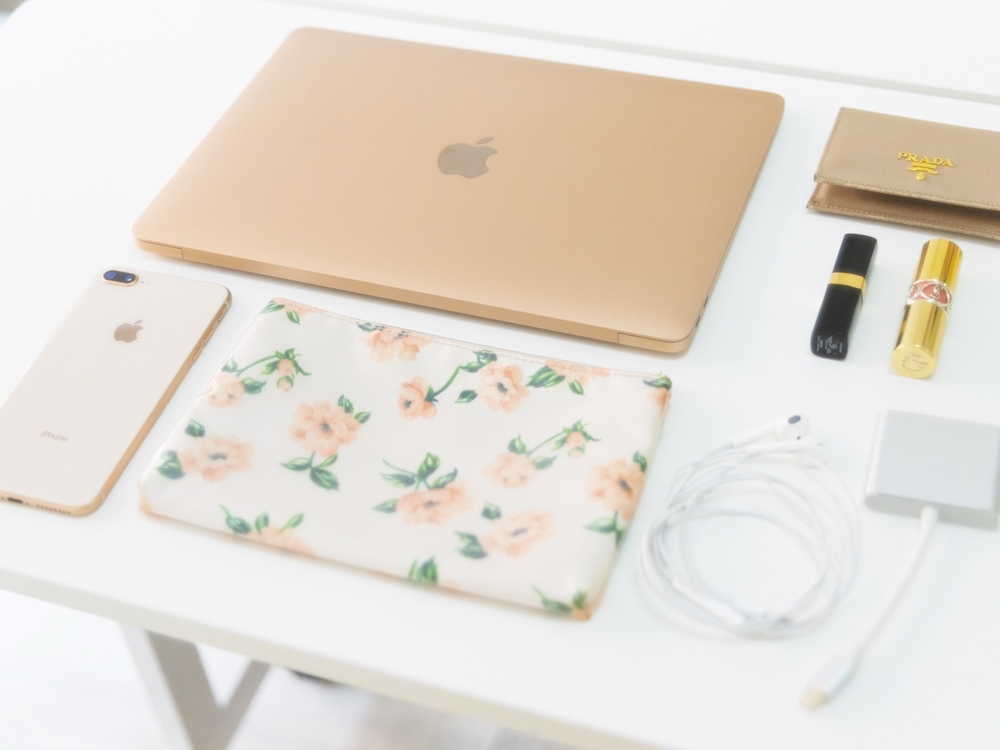 パソコン、スマートフォン、モバイルバッテリー、イヤフォン、名刺ケース、メイク道具