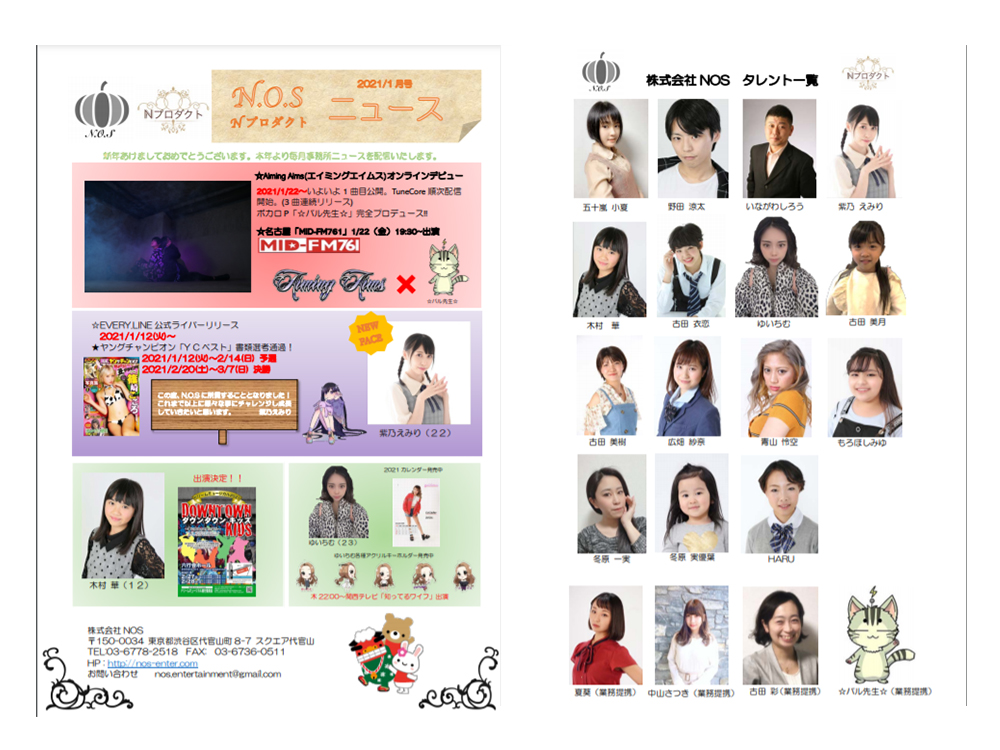 表には所属タレントが携わったお仕事の中で既に情報解禁されたものを、裏にはタレントの一覧が載っています。