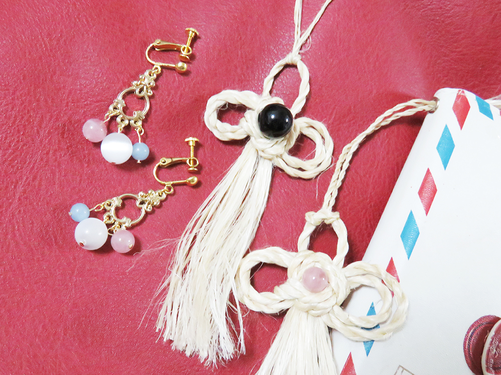 精麻だけでなく、ご希望によりパワーストーンと組み合わせて、玄関飾りやお祓い棒、ピアスやアンクレット、ブレスレットなどのアクセサリーを作っています。