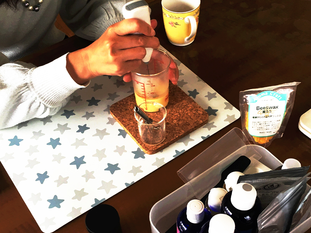 友人に誘われて参加した、アロマクリームを作るワークショップがアロマの世界に触れた最初で、その時に作ったのはティーツリーの精油を使ったミツロウクリームでした。
