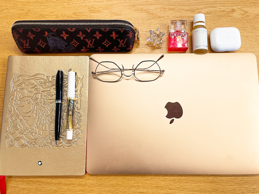 ペンケース、クリスタル(握りながら話すと直感を受けやすい)、目薬、SHIGETAのアロマオイル、Air Pods、Mac Book Air、GLOBE SPECSで購入した遠近両用メガネ、モンブランのノートとボールペン、ペリカンの万年筆です。