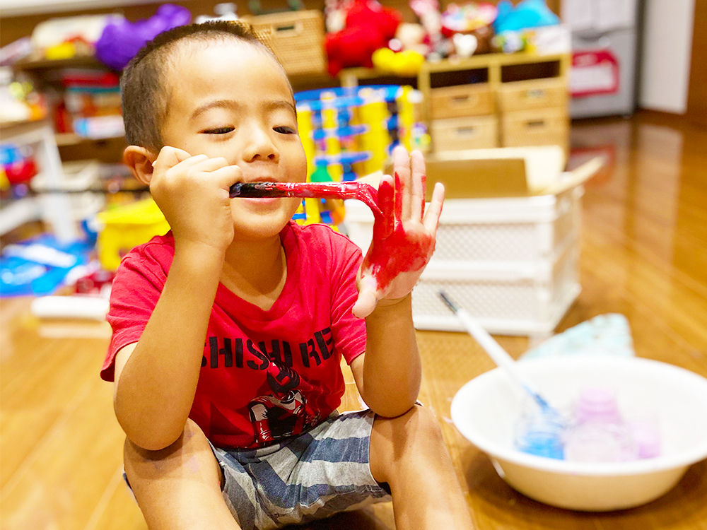 包丁でりんごの皮をむく、段ボールに絵の具で色を塗る、階段で寝るなど、子どもの好奇心を大切にしています。