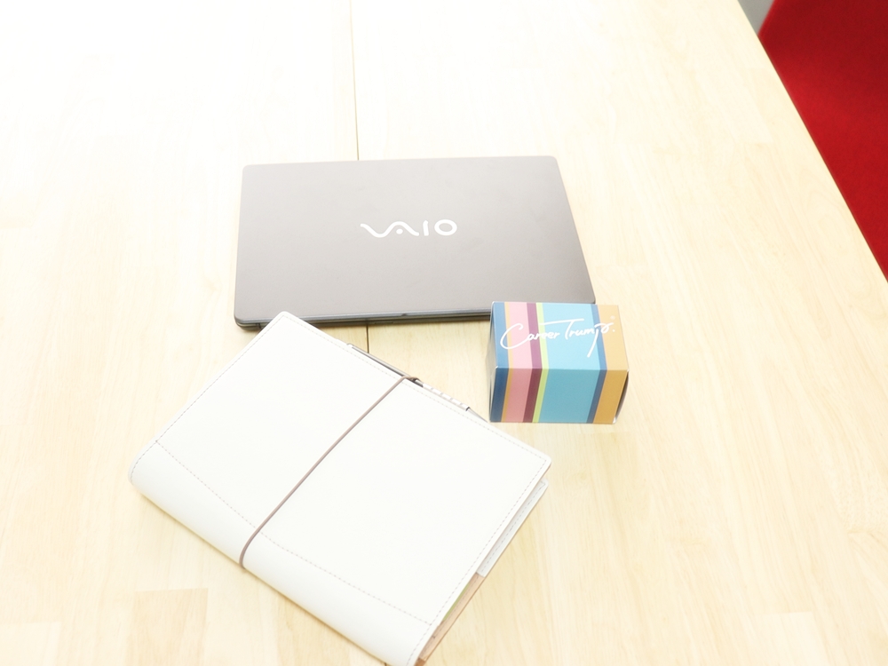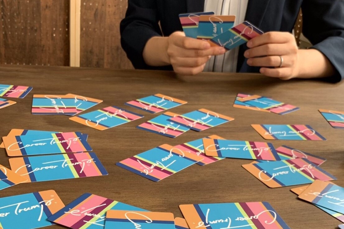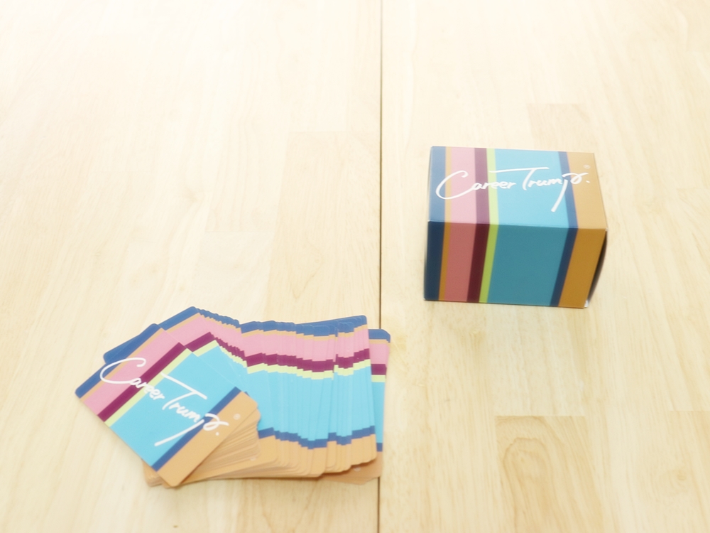 下の写真のカラフルな箱に入っているものはキャリアトランプ®というものです。誰でも簡単にゲーム感覚で取り組めるカード型のキャリア・組織支援ツールで、ファシリテーターとして活動しています。